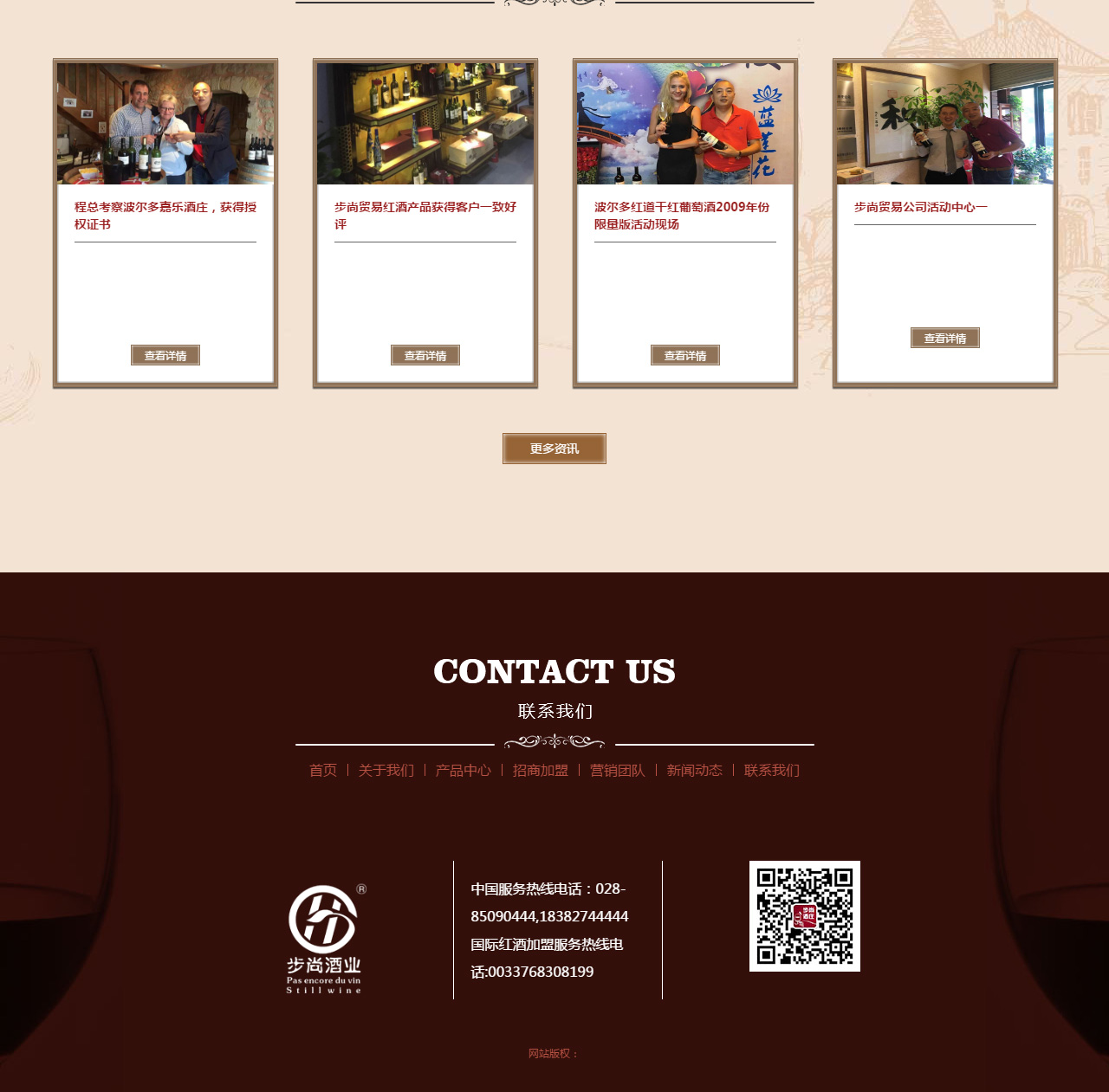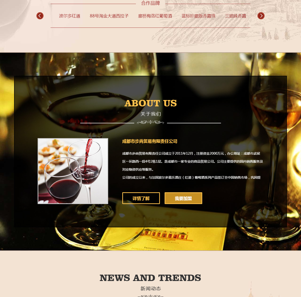 公司的成立以来,与法国波尔多嘉乐酒庄(红道)葡萄酒系列产品签订全中国销售市场,巩固提升市场营销能力,更好、更快地推动步尚原浆酒系列及美国十六区系列红酒销售在大成都区域内的良性和可持续成长。