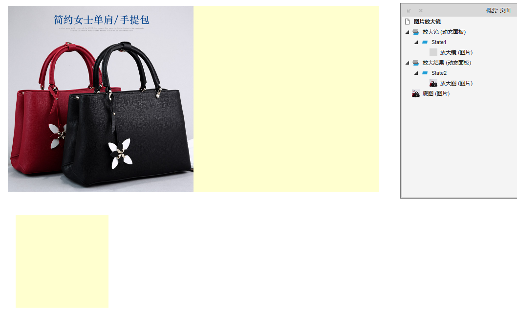 为了加深对动态面板的理解,所以尝试了图片放大镜实现效果,中间也遇到一些小问题。该练习主要用到元件跟随鼠标移动、动态面板。