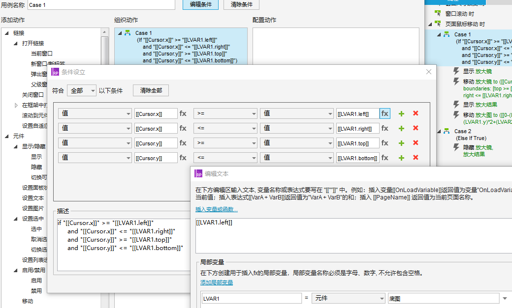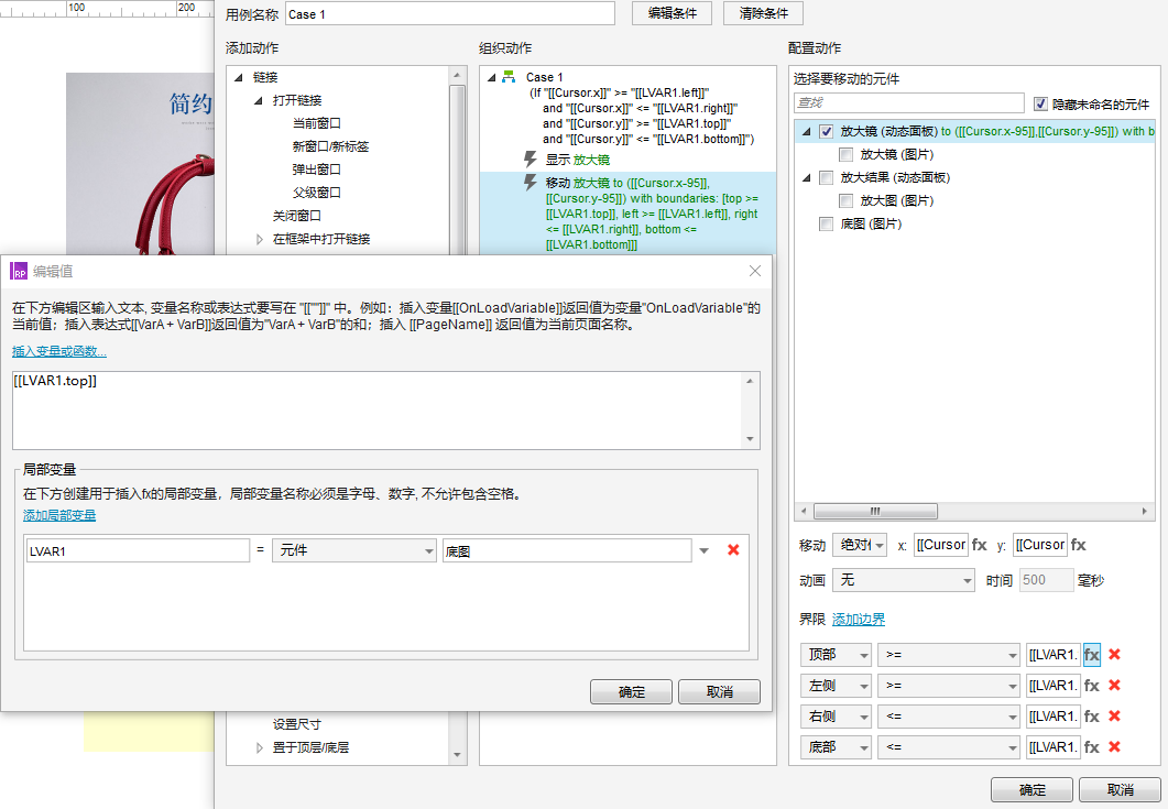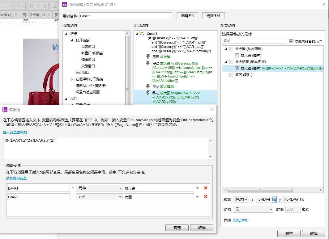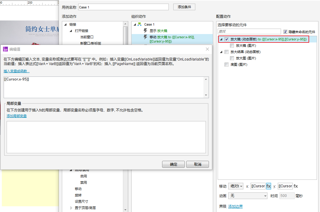 (2)页面添加【页面鼠标移动】事件,显示放大镜动态面板,设置放大镜的中心点跟随鼠标移动(放大镜宽高的一半,分别减去坐标xy),所以插入变量时,设置为:[[cursor.x-95]]。