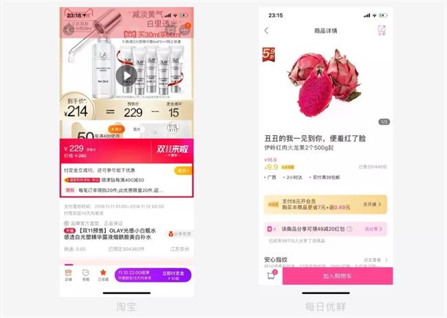 在顶部操作栏上的,样式大部分存在于详情页,以提高转化率为主要目的,界面以图片或者产品信息为主。