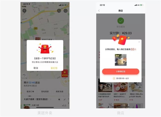以美团外卖和微店这两种不同类型的app为例,都选择采用这种形式的分享,抓住用户喜欢领红包的心理,让用户主动去分享。