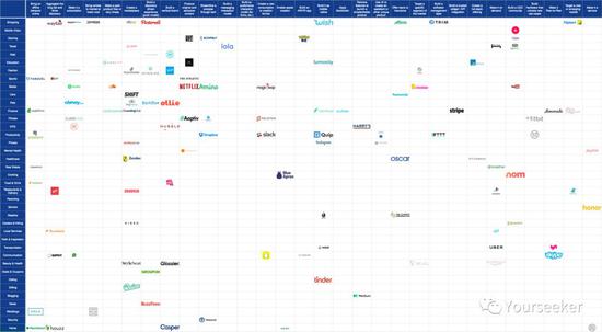 作者把 2017 年海外最热门的toc创业公司全囊括了进去。纵轴是行业,横轴是切入这些行业的具体策略。