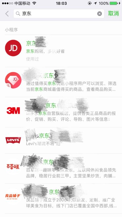 但如果完全开放小程序模糊搜索的功能,用户就可能会搜索出很多功能不精准的小程序。在这种情况下,用户就需要花一点时间对搜索结果进行筛选,那就和公众号内容搜索没什么区别了。如果用户在搜索小程序时用了太多时间,就不符合小程序即用即走的定位了。