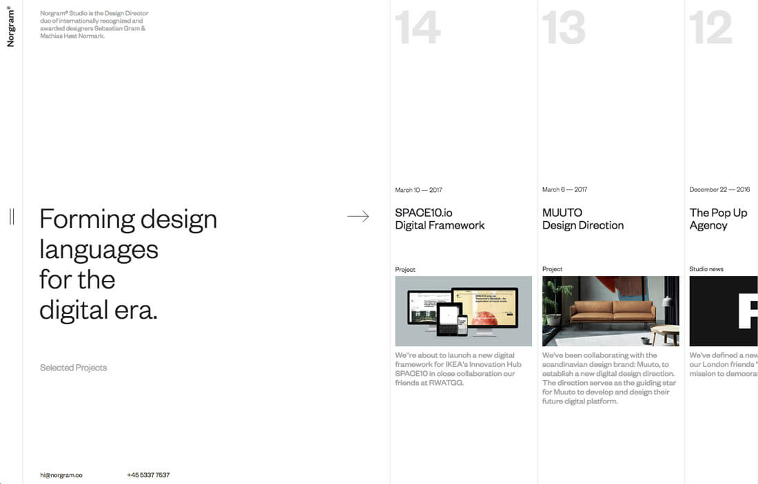 上方 norgram 这个网站就使用了部分图片作为视觉引导,向用户暗示屏幕侧面还有更多的内容可供浏览。视觉线索的存在,使得内容结构和滚动方向显得统一而自然。
