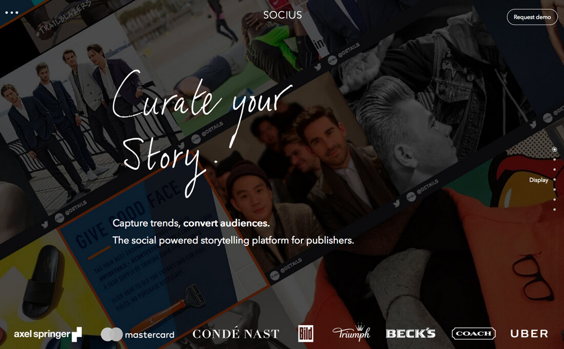 在上面的socius 页面的右侧,使用了许多同类网站都采用的小圆点来作为视觉标识,当光标悬停在小圆点上的时候,会有信息浮现,告诉用户这些区域的内容。同样的,用户可以通过点击这些小圆点快速跳转到特定的区域。