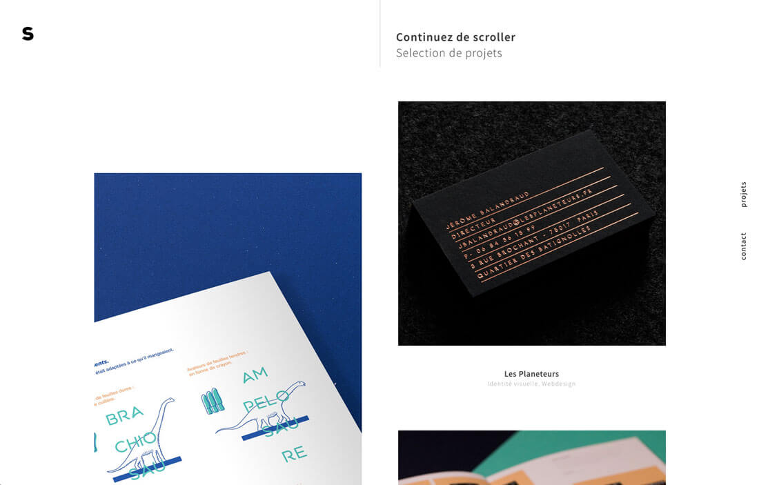 和侧边栏导航不同,这种完全旋转 90 度到右侧的文字导航,设计的更加微妙,通常出现在小型的作品展示型的网页上。就像上方这个名为s的网站。