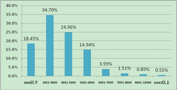 74.6%的人月平均收入在3001- 5000 元,14.94%的人在5001- 6000 元,5.5%的人在6001- 8000 元,月平均收入在 8001 元以上的占1.44%。