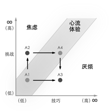 如图4-43所示,x, y轴分别表示技巧和挑战。举个例子来解释心流体验的变化。譬如一款游戏,你刚开始接触的时候,会觉得任何每一步都非常新奇,这时候你会处于a1状态,随着闯关次数的增多,逐渐失去新鲜感以后,你会焦虑是否还有更高阶的关卡可以突破,这个时候就进入a2状态。待你花一周时间终于突破了一个高阶关卡以后,又开始觉得游戏乏味而变得厌烦每天玩耍,于是你进入了a3阶段。当你继续闯关达到一定级别,后续的进阶都能得心应手,并在群体里获得一定的赞美以后,你逐步进入a4状态,a4是比a1还让你感觉具有沉浸感的阶段,这时候你就能体会到心流体验的美感。